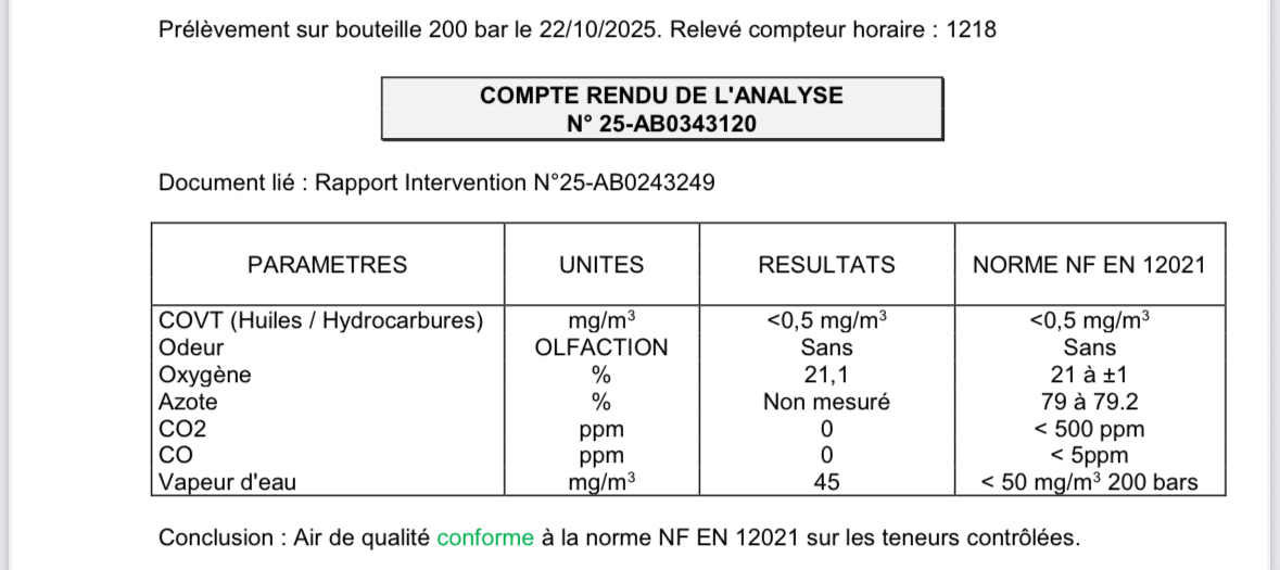 Tous les ans, le club fait vérifier par un organisme officiel, la qualité de l’air chargée dans ses blocs de plongée, afin d’être sur de la conformité avec les dernières normes en vigueur. Pour 2025, cette air est parfaitement conforme. (voir les résultats sur la photo extraite du P.V. d’analyse ci-contre).